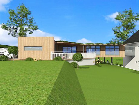 Eingeschossige Erweiterung in Holz-Tafelbauweise auf einem Hanggrundstück. Verbindung zum Bestand mittels einer geschlossenen Brücke in Stahl-/Holzbauweise.