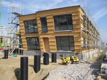Neubau einer Produktionshalle mit ca. 2320 m² GRF und eines 2-geschossigen, unterkellerten Bürogebäudes in Holztafelbauweise
