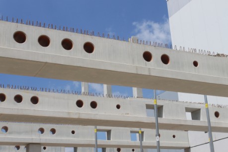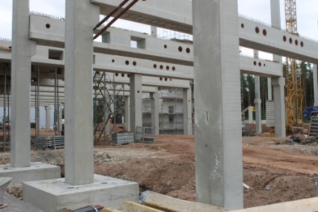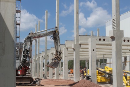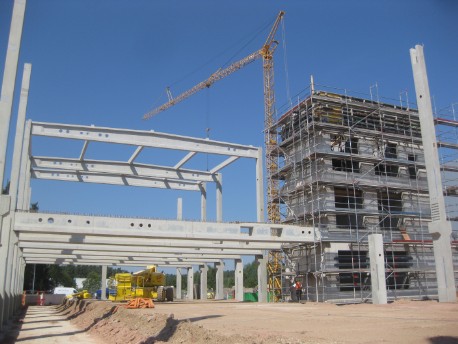 Konstruktion: Stahlbeton Fertigteile und Ortbeton-Kerne bzw. -Bodenplatte